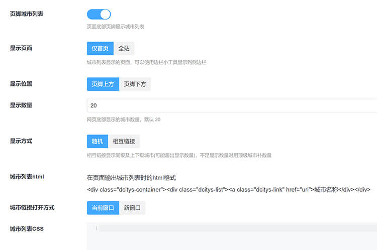 頁腳城市列表: 開啟頁腳城市列表后可以顯示分站的鏈接,類似于友情鏈接,有利于增加頁面的關聯及搜錄,顯示位置的頁腳上方和下方 是根據 WordPress 鉤子實現,部分不規范主題可能無效,顯示方式中的相互鏈接顯示規則為,顯示平級兄弟省市縣的列表,列表樣式跟主題樣式不協調時可以在城市列表CSS中進行設置。可以聯系我們進行設置噢
