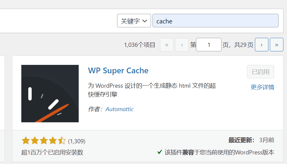 1、WP Super Cache 安裝設置都非常簡單,在后臺插件安裝也搜索 WP Super Cache ,在搜索結果中點擊立即安裝,安裝成功后啟用。