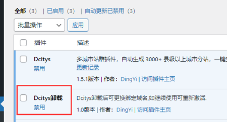Dcitys 是按域名授權,如授權后需要更換域名,需要在已安裝站群插件的網站內安裝 站群卸載插件,進行取消授權,僅能通過此方式進行更換域名,請您理解。 下載卸載插件 激活后,點擊卸載即可