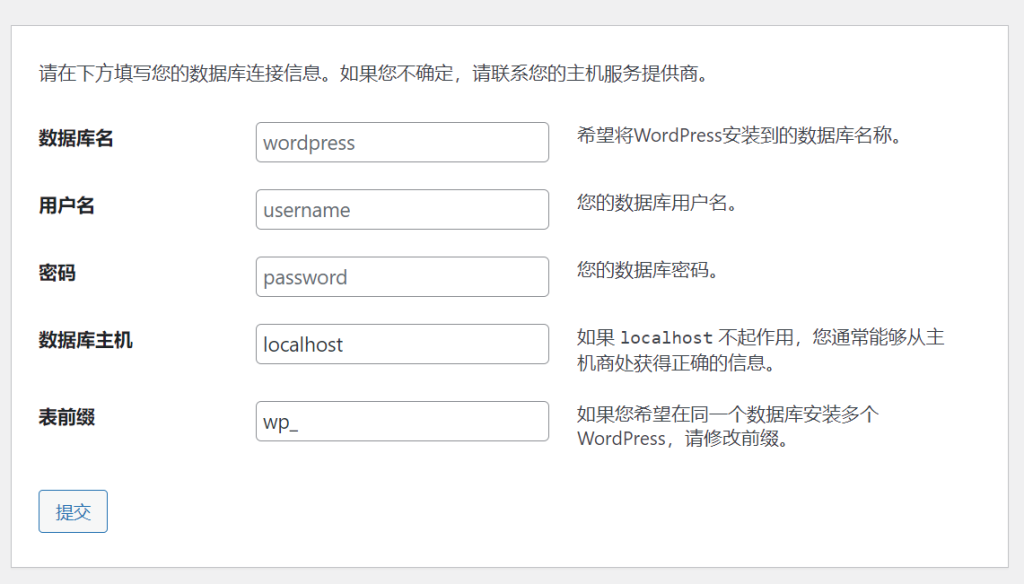 7、填寫數據庫信息,數據庫信息在虛擬機主面板的數據庫信息,數據庫主機填寫數據庫地址,表前綴可保持默認