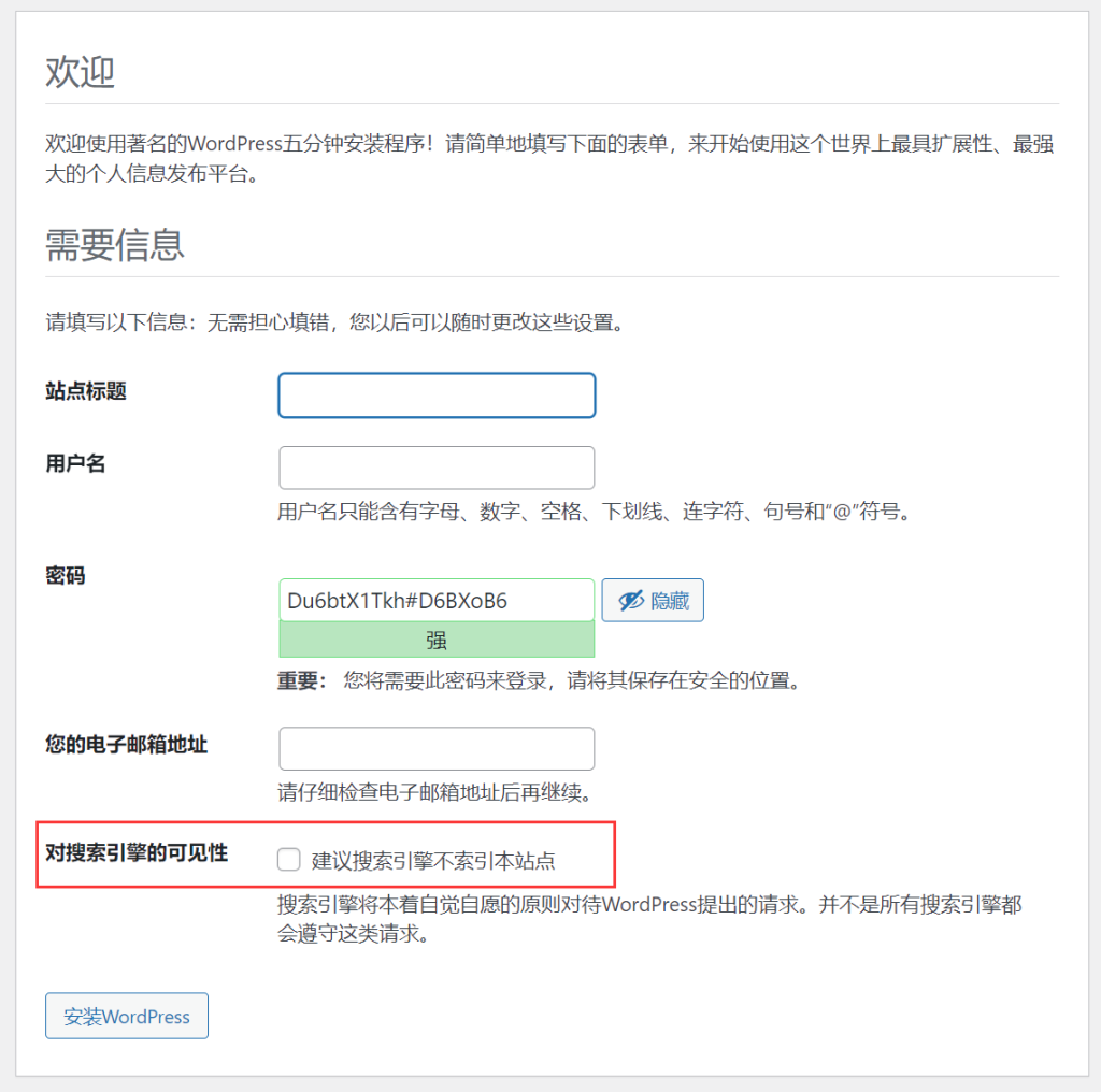9、填寫網站標題、用戶名、密碼,注意對搜索引擎的可見性一定不要勾選,