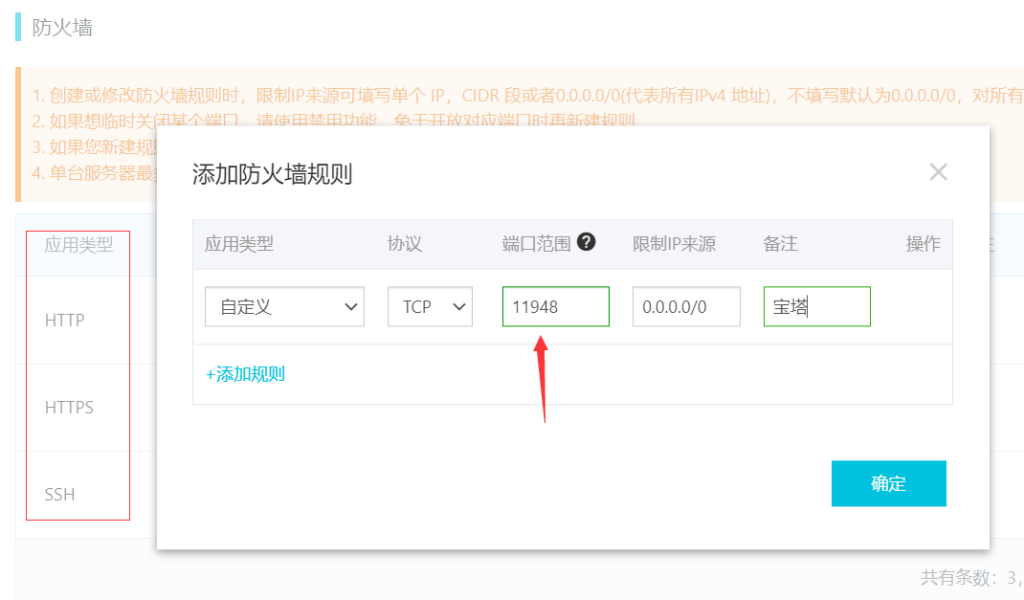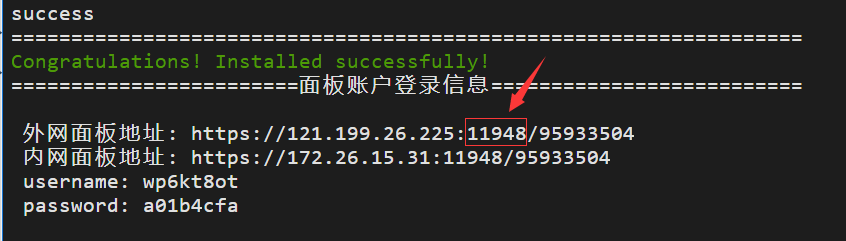 其中登錄地址中冒號后面為端口號11948,端口號為隨機產生,每次都不同,需要將此端口添加到輕量應用服務器的防火墻中,防火墻默認開啟的有 http的80端口,https的443端口,和ssh的22端口,如果沒有請添加上。
