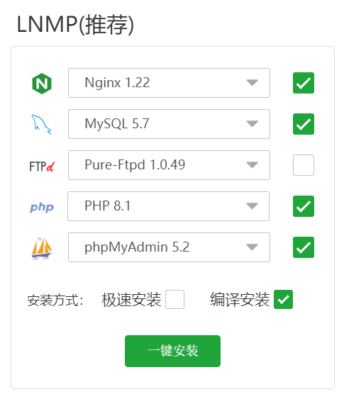 登錄后,需要同意寶塔的安裝協議并綁定寶塔賬號,如果沒有寶塔賬號需要先注冊一個,登錄后會彈出軟件安裝的界面,可以按下面的進行勾選,選擇編譯安裝雖然慢,但比較穩定,