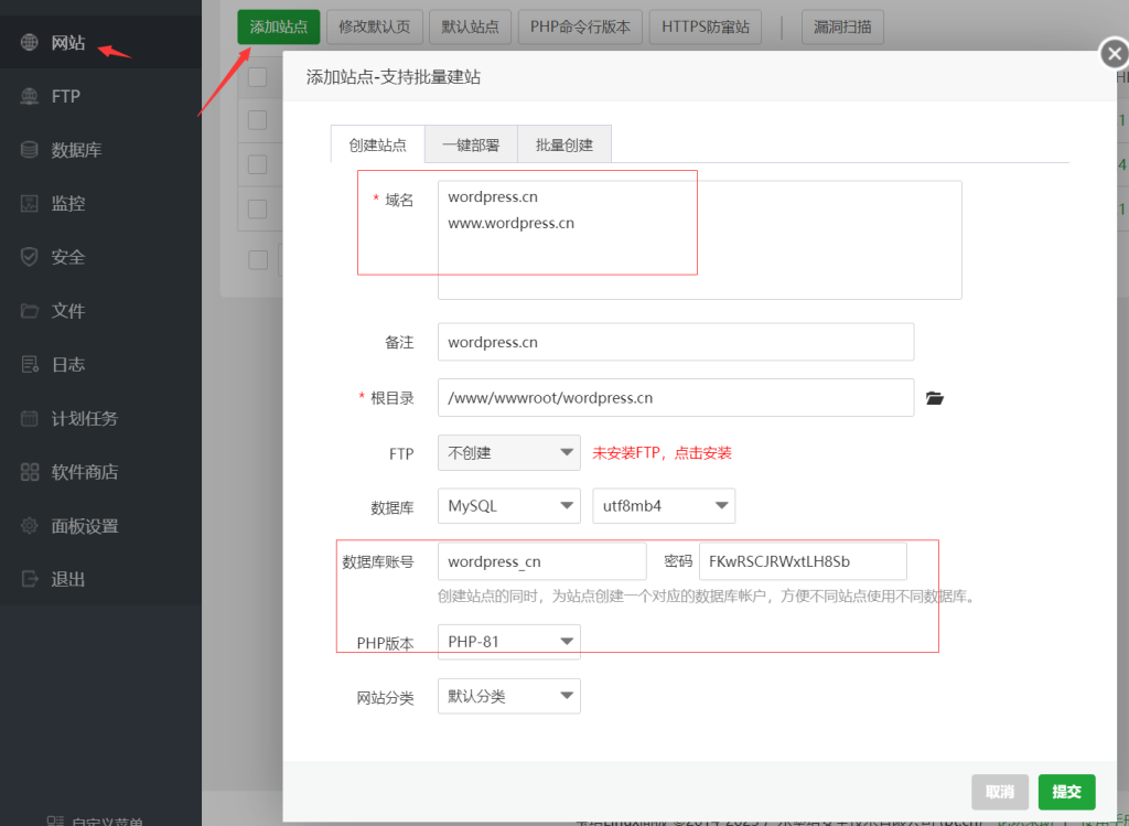 安裝完成后在網站中,添加網站,如果點擊添加網站出現提示安裝服務器軟件時,需要在軟件中再次安裝Nginx軟件。輸入域名、選擇數據庫和PHP版本等。