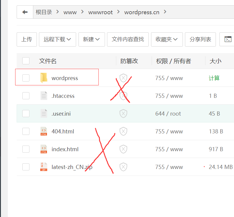 然后就可以上傳WordPress程序并進行安裝了。將下載后的WordPress 壓縮包上傳到網站的目錄中,并進行解壓,解壓后會出現一個wordpress 文件夾,將里面的所有文件復制到與 wordpress 同級目錄中。并刪除×掉的文件,注意不要選錯。