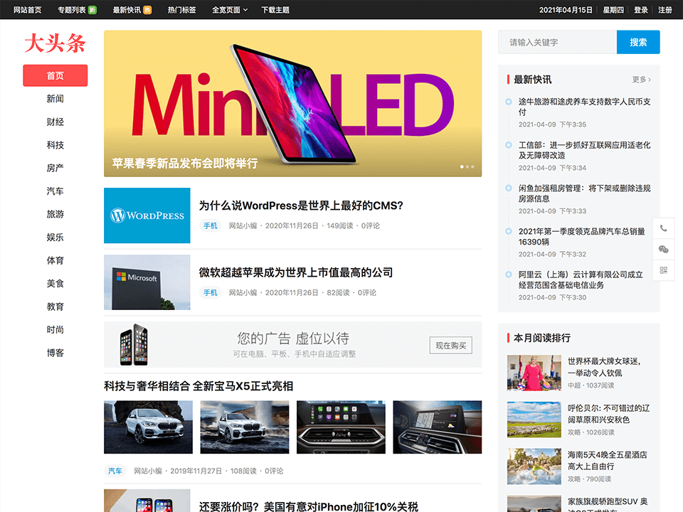 這款主題還集成了豐富的廣告位,包括網站文章列表廣告、文章內容頂部廣告、文章內容底部廣告、右側邊欄廣告(無限數量)等等廣告位,讓您的網站廣告展示更加方便快捷。